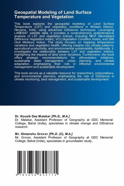 This book explores the geospatial modeling of Land Surface Temperature (LST) and vegetation conditions in Bhiwani District, Haryana, India, using advanced GIScience techniques. Leveraging LANDSAT satellite data, it provides a comprehensive spatiotemporal analysis of LST and vegetation indices, including NDVI (Normalized Difference Vegetation Index), VCI (Vegetation Condition Index), and SMI (Soil Moisture Index). The study focuses on mapping temperature variations and vegetation health, offering insights into climate patterns, agricultural productivity, and environmental sustainability. Additionally, it investigates the relationship between LST and vegetation indices, highlighting the impacts of land cover dynamics. Furthermore, the book offers strategic recommendations for afforestation initiatives, sustainable water management, urban planning, and climate adaptation, emphasizing their role in effective environmental management and sustainable development. This book serves as a valuable resource for researchers, policymakers, and environmental planners, emphasizing the role of GIScience in climate monitoring, land management, and sustainable development.