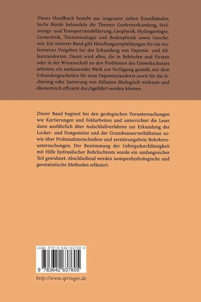 Dieses Handbuch besteht aus insgesamt sieben Einzelbänden. Sechs Bände behandeln die Themen Geofernerkundung,Strömungs- und Transportmodellierung, Geophysik, Geotechnik Hydrogeolo- gie, Tonmineralogie und Bodenphysik sowie Geochemie. Ein weiterer Band gibt Handlungsempfehlungen für ein stufenwei- ses Vorgehen bei der Erkundung von Deponie- und Altlast- standorten. Damit wird allen, die in Behörden und Firmen oder in der Wissenschaft an den Problemen des Umweltschutzes arbeiten, ein umfassendes Werk zur Verfügung gestellt, mit dem Erkundungsarbeiten für neue Deponiestandorte sowie für die Sicherung oder Sanierung von Altlasten ökologisch wirk- sam und ökonomisch effizient durchgeführt werden Können. Dieser Band beginnt bei den geologischen Voruntersuchungen wie Kartierungen und Feldarbeiten und unterrichtet die Leser dann ausführlich über Aufschlußverfahren zur Erkundung der Locker- und Festgesteine und der Grundwasserverhältnisse sowie über Probenahmetechniken und zerstörungsfreie Bohr- kernuntersuchungen. Der Bestimmung der Gebirgsdurchlässig- keit mit Hilfe hydraulischer Bohrlochtests wurde ein umfang- reicher Teil gewidmet. Abschließend werden isotopenhydrolo- gische und geostatistische Methoden erläutert.