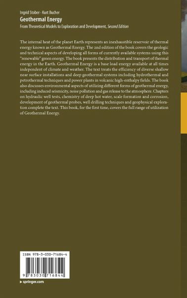 The internal heat of the planet Earth represents an inexhaustible reservoir of thermal energy known as Geothermal Energy. The 2nd edition of the book covers the geologic and technical aspects of developing all forms of currently available systems using this "renewable" green energy. The book presents the distribution and transport of thermal energy in the Earth. Geothermal Energy is a base load energy available at all times independent of climate and weather. The text treats the efficiency of diverse shallow near surface installations and deep geothermal systems including hydrothermal and petrothermal techniques and power plants in volcanic high-enthalpy fields. The book also discusses environmental aspects of utilizing different forms of geothermal energy, including induced seismicity, noise pollution and gas release to the atmosphere. Chapters on hydraulic well tests, chemistry of deep hot water, scale formation and corrosion, development of geothermal probes, well drillingtechniques and geophysical exploration complete the text. This book, for the first time, covers the full range of utilization of Geothermal Energy.