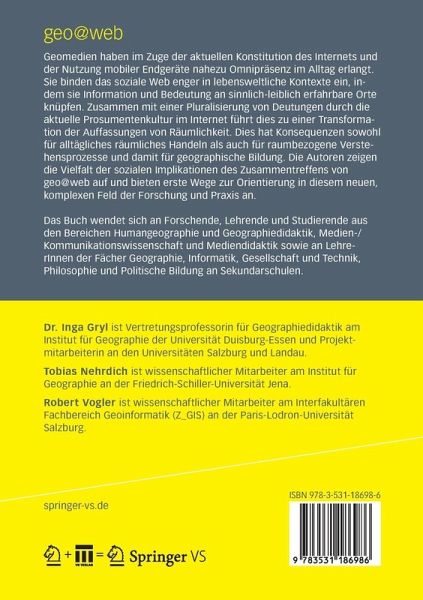 geo@web. Zur Entfaltung und Anverwandlung eines neuen Forschungsfeldes.- Auf den Punkt gebracht. Das Un- und Mittelbare von Karte und Territorium.- Zur Unverfügbarkeit des Bildes. Visuelle Logik und geographische Bildung.- Ort des Mediums - Raum der Medialität.- Visuelle Prosumtion im web2.0 - Das Ende des kritischen Konstruktivismus oder seine praktische Konsequenz?.- Das Dekonstruieren der web2.0 Karte. Vorschläge zur Analyse dynamischer und interaktiver Karten multipler und diffuser Autorenschaften.- Playful Augmentations of Space: Differenzerfahrungen im urbanen Raum?.- Weltwissen und/oder Weltverstehen 2.0? Gedanken zum Potenzial der geoweb-Techniken für die Bildung.- Botschaften via Social Net. Von Begegnungen im Rahmen virtueller Kommunikation.- "Ich weiß, wo du letzten Sommer gewesen bist!" Locational privacy - Ein Thema für den Geographieunterricht.- Das Weltweit-Werden und der umgestülpte Cyberspace.- Visualisierte Räume. Eine wissenssoziologische Perspektive auf Geomedien.- Entgrenzte Bildung durch Technologie und technologische Grenzen des Unterrichtens.