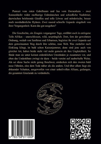 Pumuzi vom roten Gabelbaum und Jua vom Dornenhain - zwei Sonnenläufer wider rauflustige Erdmännchen und schiedliche Nashörner, dazwischen belehrende Giraffen und tolle Löwen und mörderische, besser noch mordsdämliche Hyänen. Zwei rasend schnelle Geparde eingeholt von ihrer Vergangenheit. Kann das gut ausgehen?Die Geschichte, ein Zeugnis vergangener Tage, entführt euch in entlegene Teile Afrikas - unerschlossen, wild, ursprünglich. Dort, fern der gewohnten Ordnung, weitab von Sanftmut und Erbarmen, begleitet ihr zwei Geparde auf dem gemeinsamen Weg durch ihre schöne, raue Welt. Was zunächst nach Einklang klingt, ist bald schon Katzenjammer, denn sind jene auch von gleicher Art, haben beide nicht viel mehr gemein als ihre Ungleichheit. So fände man sie unter keinen erdenklichen Umständen je zusammen vor, und eben das Undenkbare zwingt sie dazu - beide vereint auf zauberhafte Weise. Als sei diese Sache nicht genug Beschwer, entdecken sich den zweien bald neue Fährden, eine dem Tode näher als die andere. Und über allem liegt ein dräuender Schatten, ausgeworfen von einer unheilvollen Allianz, gedungen, die gesamten Graslande zu verdunkeln.