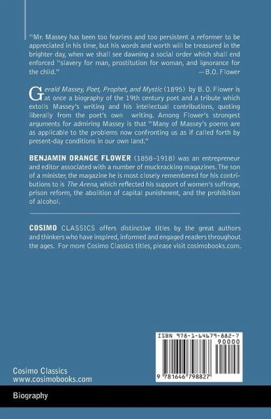 "Mr. Massey has been too fearless and too persistent a reformer to be appreciated in his time, but his words and worth will be treasured in the brighter day, when we shall see dawning a social order which shall end enforced "slavery for man, prostitution for woman, and ignorance for the child." -B.O. Flower Gerald Massey, Poet, Prophet, and Mystic (1895) by B. O. Flowers is at once a biography of the 19th century poet and a tribute which extolls Massey's writing and his intellectual contributions, quoting liberally from the poet's own writing. Among Flowers's strongest arguments for admiring Massey is that "Many of Massey's poems are as applicable to the problems now confronting us as if called forth by present-day conditions in our own land."