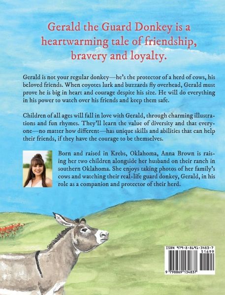 Gerald the Guard Donkey is a heartwarming tale of friendship, bravery and loyalty. Gerald is not your regular donkey-he's the protector of a herd of cows, his beloved friends. When coyotes lurk and buzzards fly overhead, Gerald must prove he is big in heart and courage despite his size. He will do everything in his power to watch over his friends and keep them safe. Children of all ages will fall in love with Gerald, through charming illustrations and fun rhymes. They'll learn the value of diversity and that everyone-no matter how different-has unique skills and abilities that can help their friends, if they have the courage to be themselves.
