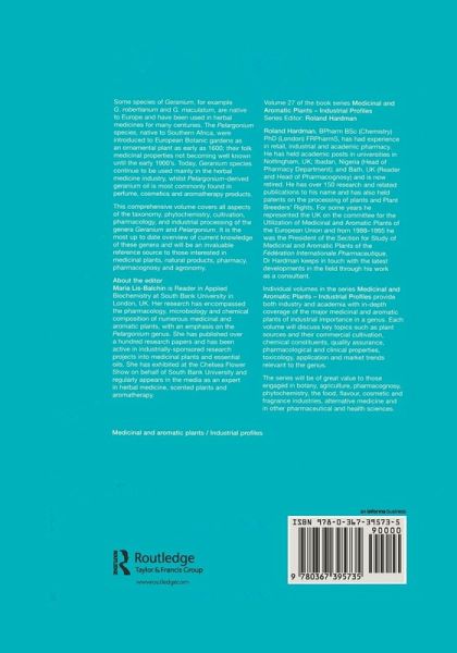 General Introduction Section Geranium. History of Nomenclature, Usage and Cultivation of Geranium and Pelargonium Species. The Taxonomy of Geranium Species and Cultivars, their Origins and Growth in the Wild. Phytochemistry of the genus Geranium. Cultivation and Harvesting of Geranium Macrorrhizum and Geranium Sanguineum for Medicinal Use in Bulgaria. Production, Extraction, Distillation and Use. Use of Geranium Species Extracts as Herbal Medicines Section Pelargonium. The Taxonomy of Pelargonium Species and Cultivars, their Origins and Growth in the Wild. Cultivation and Sales of Pelargonium Plants for Ornamental Use in the UK and Worldwide. Growing Pelargoniums in the Garden, Conservatory and for Shows. Phytochemistry of the Genus Pelargonium. Pharmacology of Pelargonium Essential Oils and Extracts in vitro and in vivo. Antimicrobial Properties of Pelargoniums. Essential Oils from Different Pelargonium Species and Cultivars and their Chemical Composition. Chemotaxonomy of Pelargonium based on Alkaloids and Essential Oils. Phylogenetical Relationships within the Genus Pelargonium based on the RAPD-PCR Method of DNA Analysis Correlated with the Essential Oil Composition. Geranium Essential Oil: Standardization, ISO; Adulteration and its Detection Using GC, Enantiomeric Columns and Bioactivity. 'Rose Scented Geranium' A Pelargonium Grown for the Perfume Industry. Cultivation and Distillation of Geranium Oil from Pelargonium Species in India. Micropropagation and Biotechnological Approaches to Tissue Culture of Pelargonium Species and Essential Oils of Scenteds. Geranium Oil and its Use in Aromatherapy. Perfumery and Cosmetic Products Utilizing Geranium Oil. New Research: Possible Uses of Various Pelargonium Leaf Oils and Extracts as Food Preservatives. Pelargonium Reniforme and Pelargonium Sidoides: their Botany, Chemistry, and Medicinal use. Insecticidal effect of Pelargonium Extracts. Correlation of the Chemical Profiles of the Essential Oil of Pelargonium (Geraniu