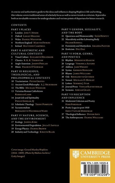 Introduction Martin Dubois Part I. Places: 1. London Jude V. Nixon 2. Oxford Lesley Higgins 3. Wales Daniel Westover 4. Northern England Martin Dubois 5. Ireland Matthew Campbell Part II. Aesthetic and Cultural Contexts: 6. Visual culture Elizabeth Helsinger 7. Classics R. K. R. Thornton 8. Anglo-Saxonism Joseph Phelan 9. Music Francis O'Gorman Part III. Religious, Theological and Philosophical Contexts: 10. Tractarianism Peter Groves 11. Ancient Greek philosophy A. J. Nickerson 12. The Bible Michael Wheeler 13. Victorian Roman Catholicism Rebekah Lamb 14. Jesuit life and spirituality Philip Endean, S. J. 15. Scholastic theology Trent Pomplun 16. Sacramentalism Bernadette Waterman Ward Part IV. Nature, Science and The Environment: 17. Ecology Joshua King 18. Environmental degradation Julia F. Saville 19. Energy physics Daniel Brown 20. Industry and technology Kirstie Blair Part V. Gender, Sexuality and The Body: 21. Queerness and homosociality Seán Hewitt 22. Masculinity and the labouring body Fraser Riddell 23. Femininity and martyrdom Amanda Paxton 24. Eroticism Duc Dau Part VI. Form, Genre and Poetics: 25. Rhythm Meredith Martin 26. Language Veronica Alfano 27. Address Jane Wright 28. Syntax Andrew Hodgson 29. Rhyme James Williams 30. Ode Bernadette Guthrie 31. Sonnet Michael D. Hurley 32. Letters Summer J. Star 33. Journal prose Vidyan Ravinthiran 34. Sermons Adrian Grafe Part VII. Reception and Influence: 35. Modernist criticism and poetry Finn Fordham 36. Poetic legacies post-1950 Emily Taylor Merriman 37. Theological influence Devon Abts 38. The Anthropocene Daniel Williams Further reading Index.