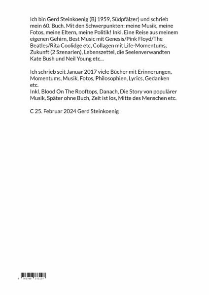 Ich bin Gerd Steinkoenig (Bj 1959, Südpfälzer) und schrieb mein 60. Buch. Mit den Schwerpunkten: meine Musik, meine Fotos, meine Eltern, meine Politik! Inkl. Eine Reise aus meinem eigenen Gehirn, Best Music mit Genesis/Pink Floyd/The Beatles/Rita Coolidge etc, Collagen mit Life-Momentums, Zukunft (2 Szenarien), Lebenszettel, die Seelenverwandten Kate Bush und Neil Young etc...Ich schrieb seit Januar 2017 viele Bücher mit Erinnerungen, Momentums, Musik, Fotos, Philosophien, Lyrics, Gedanken etc.Inkl. Blood On The Rooftops, Danach, Die Story von populärer Musik, Später ohne Buch, Zeit ist los, Mitte des Menschen etc.C 25. Februar 2024 Gerd Steinkoenig