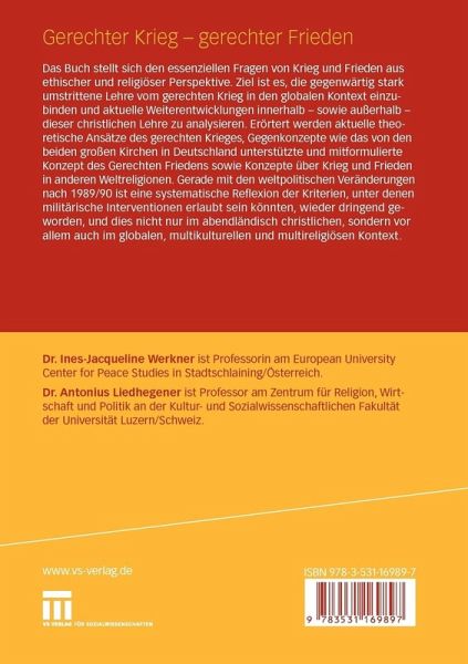 Das Buch stellt sich den essenziellen Fragen von Krieg und Frieden aus ethischer und religiöser Perspektive. Ziel ist es, die gegenwärtig stark umstrittene Lehre vom gerechten Krieg in den globalen Kontext einzubinden und aktuelle Weiterentwicklungen innerhalb - sowie außerhalb - dieser stark vom Christentum geprägten Lehre zu analysieren. Erörtert werden aktuelle theoretische Ansätze des gerechten Krieges, Gegenkonzepte wie das von den beiden großen Kirchen in Deutschland unterstützte und mitformulierte Konzept des Gerechten Friedens sowie Konzepte über Krieg und Frieden in anderen Weltreligionen. Gerade mit den weltpolitischen Veränderungen nach 1989/90 ist eine systematische Reflexion der Kriterien, unter denen militärische Interventionen erlaubt sein könnten, wieder dringend geworden, und dies nicht nur im abendländisch christlichen, sondern vor allem auch im globalen, multikulturellen und multireligiösen Kontext.
