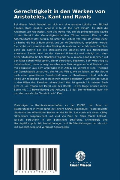 Bei dieser Arbeit handelt es sich um eine erneute Lektüre von Michael Sandels Buch "Justice: what is it to do the right thing?". Es stellt die Ansichten von Aristoteles, Kant und Rawls vor, die die philosophische Studie in den Bereich der Gerechtigkeitstheorien führen werden. Dies ist die Abschlussarbeit des Kurses, die unter der Leitung von Prof. Dr. Álvaro Oxley da Rocha die beste Note erhielt und zur Veröffentlichung empfohlen wurde. Sie richtet sich sowohl an den Neuling als auch an den erfahrenen Forscher, denn die Schrift soll die philosophische Weisheit und das Nachdenken erweitern. Sandel lehrt an der Harvard University und schlägt vor, dass seine Studenten ihn bei aktuellen Ereignissen in seinem Land zusammen mit den klassischen Philosophen, die er porträtiert, begleiten. Sein Vorschlag ist bahnbrechend, denn er zeigt verschiedene Strömungen auf und illustriert sie mit Beispielen aus dem amerikanischen Alltag, die universell sind. Theorien der Gerechtigkeit versuchen, die Art und Weise, wie wir leben, auf der Suche nach einer gerechteren Gesellschaft neu zu überdenken. Lässt sich die Politik von religiösen und moralischen Fragen abkoppeln? Darf sich der Staat in den Willen des Einzelnen einmischen? Was ist gerecht? In seinem Buch geht es um Fragen der Moral und des Rechts. "Zwei Dinge erfüllen meine Seele mit [...] Bewunderung und Achtung [...]: der Sternenhimmel über mir und das moralische Gesetz in mir" Kant.