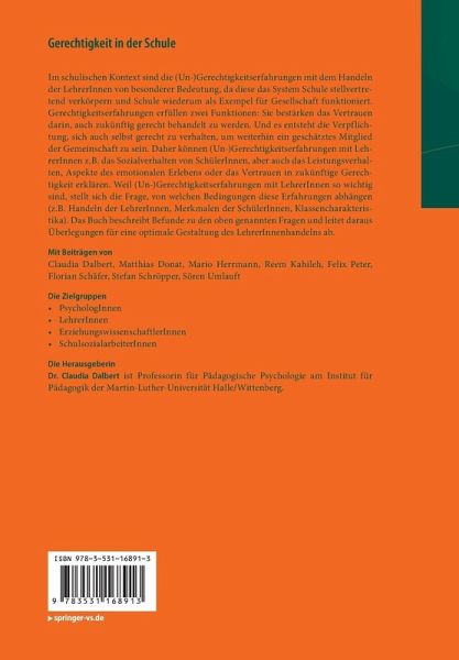 Im schulischen Kontext sind die (Un-)Gerechtigkeitserfahrungen mit dem Handeln der LehrerInnen von besonderer Bedeutung, da diese das System Schule stellvertretend verkörpern und Schule wiederum als Exempel für Gesellschaft funktioniert. Gerechtigkeitserfahrungen erfüllen zwei Funktionen: Sie bestärken das Vertrauen darin, auch zukünftig gerecht behandelt zu werden. Und es entsteht die Verpflichtung, sich auch selbst gerecht zu verhalten, um weiterhin ein geschätztes Mitglied der Gemeinschaft zu sein. Daher können (Un-)Gerechtigkeitserfahrungen mit LehrerInnen z.B. das Sozialverhalten von SchülerInnen, aber auch das Leistungsverhalten, Aspekte des emotionalen Erlebens oder das Vertrauen in zukünftige Gerechtigkeit erklären. Weil (Un-)Gerechtigkeitserfahrungen mit LehrerInnen so wichtig sind, stellt sich die Frage, von welchen Bedingungen diese Erfahrungen abhängen (z.B. Handeln der LehrerInnen, Merkmalen der SchülerInnen, Klassencharakteristika). Das Buch beschreibt Befunde zu den oben genannten Fragen und leitet daraus Überlegungen für eine optimale Gestaltung des LehrerInnenhandelns ab.