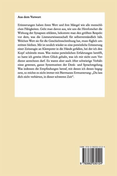 Aus dem Vorwort: Erinnerungen haben ihren Wert und ihre Mängel wie alle menschlichen Fähigkeiten. Geht man davon aus, wie uns die Hirnforscher die Wirkung der Synapsen erklären, bekommt man den größten Respekt vor dem, was die Literaturwissenschaft für selbstverständlich hält. Welchen Wert sie für die Geschichtsschreibung hat, muss füglich umstritten bleiben. Mir ist neulich wieder so eine persönliche Erinnerung einer Zeitzeugin an Klemperer in die Hände gefallen, bei der ich den Kopf schütteln muss. Was meine persönlichen Erfahrungen betrifft, so hatte ich gewiss öfters Glück gehabt, was ich mir nicht zum Verdienst anrechnen darf. Es waren aber auch öfter schwierige Verhältnisse gewesen, ganze Systemzeiten der Denk- und Sprachregelung. Was indessen die Empfindungen betraf, mit denen ich denen begegnete, so reichte es nicht immer mit Biermanns Ermunterung: "Du lass dich nicht verhärten, in dieser schweren Zeit."