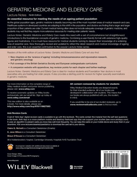 GERIATRIC MEDICINE AND ELDERLY CARE Lecture Notes Ninth Edition An essential resource for meeting the needs of an ageing patient population As the global population ages, geriatric medicine is steadily becoming one of the most important areas of medical research and care. Healthcare systems in developed countries are adapting to this shift in the population, and doctors are finding that a larger and larger proportion of their patients are older. Current medical training often does not include adequate coverage of geriatric medicine, and students may well find they require more extensive resources for meeting older patients' needs. Lecture Notes: Geriatric Medicine and Elderly Care meets this need with a set of comprehensive but straightforward introductions to the foundational concepts of geriatric medicine. Combining a user-friendly format with extensive high-quality figures and illustrations, it is a must-have resource for medical students looking to deepen their knowledge of a widening area of essential care. Now thoroughly revised and updated to reflect the latest research and medical knowledge of ageing and elder care, this is an essential contribution to the popular Lecture Notes series. Readers of the ninth edition of Lecture Notes: Geriatric Medicine and Elderly Care will also find: * New chapters on the 'science of ageing' including immunosenescence and rejuvenation research, and geriatric oncology * Full coverage of the British Geriatrics Society and European undergraduate curriculums * A companion website with appendices, key revision points for each chapter and further readings Lecture Notes: Geriatric Medicine and Elderly Care is ideal for medical students and Foundation Year doctors in most specialties who are treating frail older people. It also provides a starting point for revision for higher specialty examinations in geriatric medicine. Anki Revision Cards A set of 'Anki App' digital revision cards is available to go with this textbook. The cards contain the material from the self-test questions in the book. Anki App is a cross-platform mobile and desktop flashcard app that can support your studies (see www.ankiapp.com). It uses an algorithm to present cards you know less well more frequently. You can keep the cards on your mobile device and study them in your downtime. Visit www.lecturenoteseries/paediatrics to download the card set to your device.