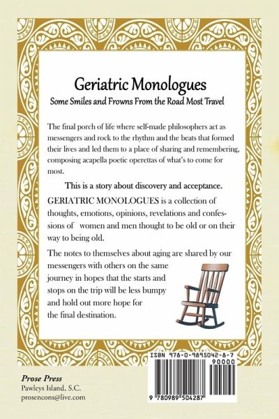Geriatric Monologues, a Readers Theater Play in One and Two Act formats. Some Smiles and Frowns From the Road Most Travel The final porch of life where self-made philosophers act as messengers and rock to the rhythm and the beats that formed their lives and lead them to a place of sharing and remembering, composing acapella poetic operettas of what's to come for most. This is a story about discovery and acceptance. GERIATRIC MONOLOGUES is a collection of thoughts, emotions, opinions, revelations and confessions of women and men thought to be old or on their way to being old. The notes to themselves about growing old are shared by our messengers with others on the same journey in hopes that the starts and stops on the trip will be less bumpy and hold out more hope for the final destination.