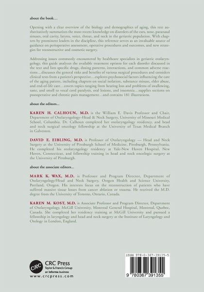 Opening with a clear overview of the biology and demographics of aging, this text authoritatively summarizes the most recent knowledge on disorders of the ears, nose, paranasal sinuses, oral cavity, larynx, voice, throat, and neck in the geriatric population. With chapters by prominent leaders in the discipline, this reference serves as an invaluable source of guidance on perioperative assessment, operative procedures and outcomes, and new strategies for reconstructive and cosmetic surgery.