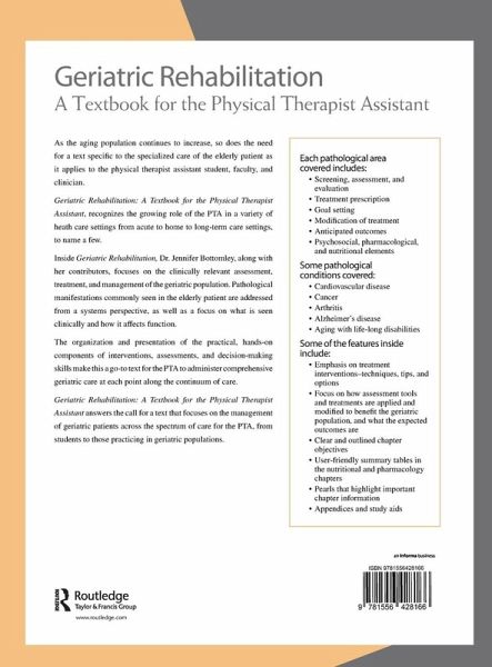Recognizes the role of the physical therapist assistant (PTA) in a variety of heath care settings from acute to home to long-term care settings. This book focuses on the clinically relevant assessment, treatment, and management of the geriatric population. It emphasises on treatment interventions - techniques, tips, and options.