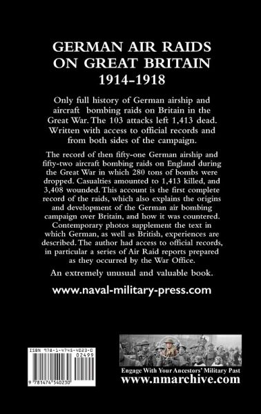 Only full history of German airship and aircraft bombing raids on Britain in the Great War. The 103 attacks left 1,413 dead. Written with access to official records and from both sides of the campaign. The record of then fifty-one German airship and fifty-two aircraft bombing raids on England during the Great War in which 280 tons of bombs were dropped. Casualties amounted to 1,413 killed, and 3,408 wounded. This account is the first complete record of the raids, which also explains the origins and development of the German air bombing campaign over Britain, and how it was countered. Contemporary photos supplement the text in which German, as well as British, experiences are described. The author had access to official records, in particular a series of Air Raid reports prepared as they occurred by the War Office. An extremely unusual and valuable book.