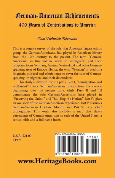 This is a concise survey of the role that America's largest ethnic group, the German-Americans, has played in American history from the 17th century to the present. The term "German-American" in this volume refers to immigrants and their offspring from Germany, Austria, Switzerland and other German-speaking areas of Europe. Hence, the term "German" is used in a linguistic, cultural and ethnic sense to cover the sum of German-speaking immigrants and their descendants. This study is divided into six parts. Part I, "Immigration and Settlement" traces German-American history from the earliest beginnings into the present time, while Parts II and III demonstrate the role German-Americans have played in "Preserving the Union" and "Building the Nation." Part IV gives an overview of the German-American experience. Part V discusses German-American Heritage Month, and Part VI is a select bibliography. Also includes map that shows percentages of German-Americans in each of the United States, a census table and a fullname index.