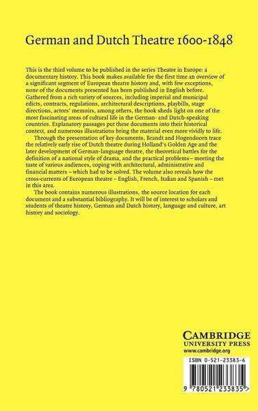 This is the third volume to be published in the series Theatre in Europe. This book makes available for the first time an over-view of a significant segment of European theatre history and, with few exceptions, none of the documents presented have been published in English before. Gathered from a rich variety of sources, including imperial and municipal edicts, contracts, architectural descriptions, playbills, stage directions, and actors' memoirs among others, the book sheds light on one of the most fascinating areas of cultural life in the German- and Dutch-speaking countries. Explanatory passages put these documents into their historical context, and numerous illustrations bring the material even more vividly to life. Also included is the source location for each document and a substantial bibliography.