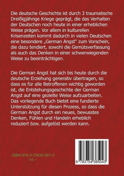 Das Buch German Angst - Ihre geschichtlichen Wurzeln und ihre ideologische Aufarbeitung beleuchtet ein besonderes Symptom der traditionellen Standeskultur: Die Entstehung einer übernatürlichen Angst, die nicht nur die menschliche Seele, sondern auch den menschlichen Verstand lähmt. Davon waren und sind die deutschen Völker in einer besonderen Weise betroffen.Die deutsche Geschichte ist durch 3 traumatische Dreißigjährige Kriege und durch 350 Jahre einer "Schwarzen Pädagogik" geprägt, die das Verhalten der Deutschen noch heute in einer erheblichen Weise beeinflussen. Vor allem in persönlichen und kulturellen Krisenzeiten kommt dadurch in vielen Deutschen eine besondere "German Angst" zum Vorschein, die durch ein besseres Verständnis der menschlichen Natur erheblich reduziert werden kann.