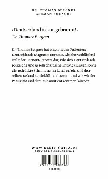 Dr. Thomas Bergner hat einen neuen Patienten: Deutschland! Diagnose: Burnout. Absolut verblüffend stellt der Burnout-Experte dar, wie sich Deutschlands politische und gesellschaftliche Entwicklungen sowie die gedrückte Stimmung im Land auf ein und denselben Befund zurückführen lassen - und wie wir der Passivität und dem Missmut entkommen können.