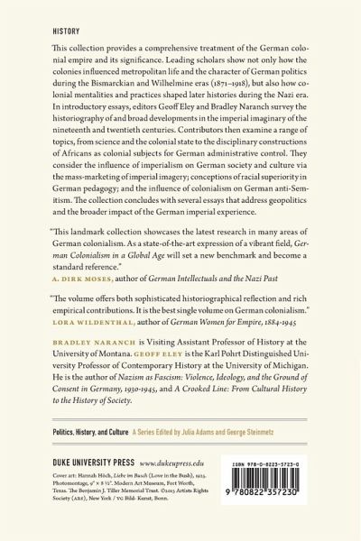 This collection provides a comprehensive treatment of the German colonial empire and its significance. Leading scholars show not only how the colonies influenced metropolitan life and the character of German politics during the Bismarckian and Wilhelmine eras (1871–1918), but also how colonial mentalities and practices shaped later histories during the Nazi era. In introductory essays, editors Geoff Eley and Bradley Naranch survey the historiography and broad developments in the imperial imaginary of the nineteenth and twentieth centuries. Contributors then examine a range of topics, from science and the colonial state to the disciplinary constructions of Africans as colonial subjects for German administrative control. They consider the influence of imperialism on German society and culture via the mass-marketing of imperial imagery; conceptions of racial superiority in German pedagogy; and the influence of colonialism on German anti-Semitism. The collection concludes with several essays that address geopolitics and the broader impact of the German imperial experience. Contributors. Dirk BÖnker, Jeff Bowersox, David Ciarlo, Sebastian Conrad, Christian S. Davis, Geoff Eley, Jennifer Jenkins, Birthe Kundus, Klaus MÜhlhahn, Bradley Naranch, Deborah Neill, Heike Schmidt, J. P. Short, George Steinmetz, Dennis Sweeney, Brett M. Van Hoesen, Andrew Zimmerman