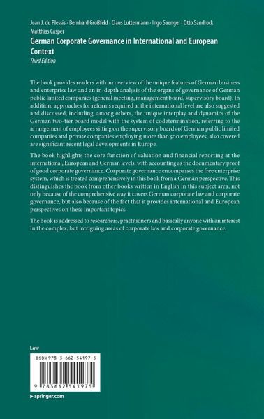 The book provides readers with an overview of the unique features of German business and enterprise law and an in-depth analysis of the organs of governance of German public limited companies (general meeting, management board, supervisory board). In addition, approaches for reforms required at the international level are also suggested and discussed, including, among others, the unique interplay and dynamics of the German two-tier board model with the system of codetermination, referring to the arrangement of employees sitting on the supervisory boards of German public limited companies and private companies employing more than 500 employees; also covered are significant recent legal developments in Europe.The book highlights the core function of valuation and financial reporting at the international, European and German levels, with accounting as the documentary proof of good corporate governance. Corporate governance encompasses the free enterprise system, whichis treated comprehensively in this book from a German perspective. This distinguishes the book from other books written in English in this subject area, not only because of the comprehensive way it covers German corporate law and corporate governance, but also because of the fact that it provides international and European perspectives on these important topics.The book is addressed to researchers, practitioners and basically anyone with an interest in the complex, but intriguing areas of corporate law and corporate governance.