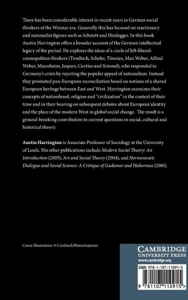 There has been considerable interest in recent years in German social thinkers of the Weimar era. Generally, this has focused on reactionary and nationalist figures such as Schmitt and Heidegger. In this book, Austin Harrington offers a broader account of the German intellectual legacy of the period. He explores the ideas of a circle of left-liberal cosmopolitan thinkers (Troeltsch, Scheler, Tönnies, Max Weber, Alfred Weber, Mannheim, Jaspers, Curtius, and Simmel) who responded to Germany's crisis by rejecting the popular appeal of nationalism. Instead, they promoted pan-European reconciliation based on notions of a shared European heritage between East and West. Harrington examines their concepts of nationhood, religion, and 'civilization' in the context of their time and in their bearing on subsequent debates about European identity and the place of the modern West in global social change. The result is a groundbreaking contribution to current questions in social, cultural and historical theory.