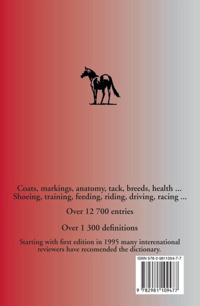 German-English and English-German. Over 13000 entries and 1300 definitions about coats, markings, training, anatomy, farriery, equipment, breeds and breeding, health, feeding, riding, racing, driving etc. Since first unabridged multilingual edition in 1995 the dictionary have been recommended by many reviewers and journalists.