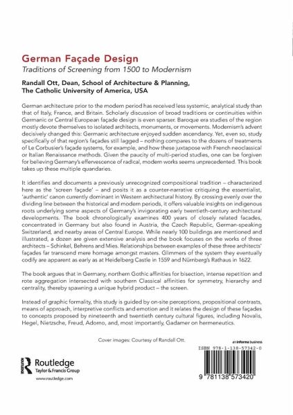 German architecture prior to the modern period has received less systemic, analytical study than that of Italy, France, and Britain. Scholarly discussion of broad traditions or continuities within Germanic or Central European façade design is even sparser. Baroque era studies of the region mostly devote themselves to isolated architects, monuments, or movements. Modernism's advent decisively changed this: Germanic architecture enjoyed sudden ascendancy. Yet, even so, study specifically of that region's façades still lagged - nothing compares to the dozens of treatments of Le Corbusier's façade systems, for example, and how these juxtapose with French neoclassical or Italian Renaissance methods. Given the paucity of multi-period studies, one can be forgiven for believing Germany's effervescence of radical, modern works seems unprecedented. This book takes up these multiple quandaries. It identifies and documents a previously unrecognized compositional tradition - characterized here as the 'screen façade' - and posits it as a counter-narrative critiquing the essentialist, 'authentic' canon currently dominant in Western architectural history. By crossing evenly over the dividing line between the historical and modern periods, it offers valuable insights on indigenous roots underlying some aspects of Germany's invigorating early twentieth-century architectural developments. The book chronologically examines 400 years of closely related facades, concentrated in Germany but also found in Austria, the Czech Republic, German-speaking Switzerland, and nearby areas of Central Europe. While nearly 75 buildings are mentioned and illustrated, a dozen are given extensive analysis and the book focuses on the works of three architects - Schinkel, Behrens and Mies. Relationships between examples of these three architects' façades far transcend mere homage amongst masters. Glimmers of the system they eventually codify are apparent as early as at Heidelberg Castle in 1559 and Nürnberg's Rathaus in 1622. The book argues that in Germany, northern Gothic affinities for bisection, intense repetition and rote aggregation intersected with southern Classical affinities for symmetry, hierarchy and centrality, thereby spawning a unique hybrid product - the screen. Instead of graphic formality, this study is guided by on-site perceptions, propositional contrasts, means of approach, interpretive conflicts and emotion and it relates the design of these façades to concepts proposed by contemporary philosophers including Novalis, Hegel, Nietzsche, Freud, Adorno, and, most importantly, Gadamer on hermeneutics.