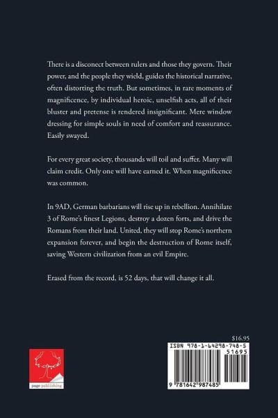There is a disconect between rulers and those they govern. Their power, and the people they wield, guides the historical narrative, often distorting the truth. But sometimes, in rare moments of magnificence, by individual heroic, unselfish acts, all of their bluster and pretense is rendered insignificant. Mere window dressing for simple souls in need of comfort and reassurance. Easily swayed. For every great society, thousands will toil and suffer. Many will claim credit. Only one will have earned it. When magnificence was common. In 9AD, German barbarians will rise up in rebellion. Annihilate 3 of Rome's finest Legions, destroy a dozen forts, and drive the Romans from their land. United, they will stop Rome's northern expansion forever, and begin the destruction of Rome itself, saving Western civilization from an evil Empire. Erased from the record, is 52 days, that will change it all.