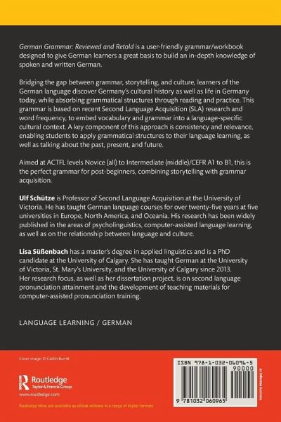 Bridging the gap between grammar, storytelling, and culture, learners of the German language discover Germany's cultural history as well as life in Germany today, while absorbing grammatical structures through reading and practice. This grammar is based on recent Second Language Acquisition (SLA) research and word frequency, to embed vocabulary and grammar into a language-specific cultural context. A key component of this approach is consistency and relevance, enabling students to apply grammatical structures to their language learning, as well as talking about the past, present, and future.