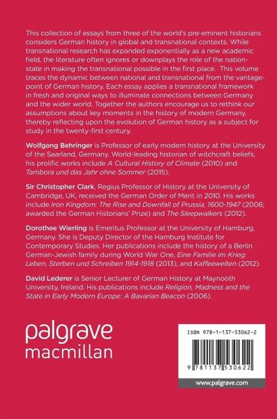 This is a collection of essays from three of the world's pre-eminent historians of Germany, which consider German history in global and transnational contexts. It is well known that transnationalism has exploded in the last decade or so as a new academic subfield of international and global history. What the transnationalism literature often ignores or downplays, however, is the role of the nation-state in making the transnational possible in the first place, as noted in its very etymological origins. This volume traces this dynamic from a different vantage-point, namely the relationship between German history and transnationalism. Each essay applies a transnational framework in fresh and original ways in order to illuminate different facets of the connections between Germany and the wider world in the modern period. Together they will encourage the rethinking of assumptions about key moments and developments in the history of modern Germany, and foster reflection on the evolving nature of German history as a subject studied in the twenty-first century.