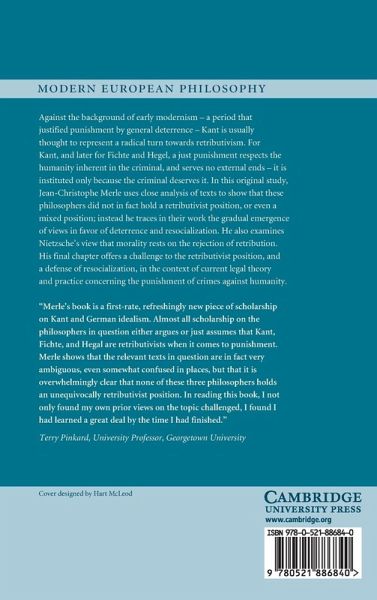 Against the background of early modernism - a period that justified punishment by general deterrence - Kant is usually thought to represent a radical turn towards retributivism. For Kant, and later for Fichte and Hegel, a just punishment respects the humanity inherent in the criminal, and serves no external ends - it is instituted only because the criminal deserves it. In this original study, Jean-Christophe Merle uses close analysis of texts to show that these philosophers did not in fact hold a retributivist position, or even a mixed position; instead he traces in their work the gradual emergence of views in favour of deterrence and resocialisation. He also examines Nietzsche's view that morality rests on the rejection of retribution. His final chapter offers a challenge to the retributivist position, and a defence of resocialisation, in the context of current legal theory and practice concerning the punishment of crimes against humanity. This original study examines the views of Kant, Fichte and Hegel on punishment, and traces in their work the gradual emergence of views in favour of deterrence and resocialisation. Merle also examines Nietzsche's view that morality rests on the rejection of retribution.