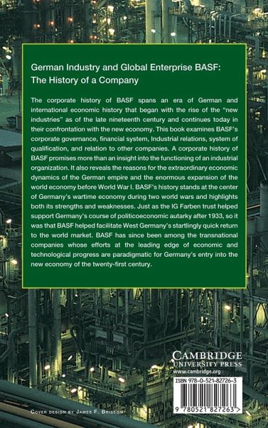 Introduction; Part I. Becoming a Global Corporation - BASF from 1865 to 1900 Wolfgang von Hippel: 1. The prehistory; 2. The early years (1865-1873); 3. Between science and the marketplace - BASF in the 'Dyestuffs Age', 1973-1900; Part II. The Power of Synthesis (1900-1925) Jeffrey Allen Johnson: 1. A company in transition; 2. From Dreibund to von Brunck's death (1904-1911); 3. From Oppau to Leuna: synthetic ammonia and war (1912-1918); 4. From crisis to fusion (1919-1925); Part III. From the I. G. Farben Fusion to the Establishment of BASF AG (1925-1952) Raymond G. Stokes: 1. Introduction; 2. Fitting into the new concern, 1925-1929; 3. Coping with the crisis, 1929-1933; 4. Accommodation and conflict, 1933-1936; 5. Autarky and the preparation for war, 1936-1939; 6. The Upper Rhine group in German-dominated Europe, 1939-1942; 7. The BASF group in total war, 1942-1945; 8. From occupation to refounding, 1945-1952; Part IV. BASF Since its Refounding in 1952 Werner Abelshauser: 1. The past has a future: launching BASF anew; 2. Corporate culture: tradition as a resource?; 3. Old markets, new basis: early breakthrough to petrochemistry; 4. Tradition and distance: the second break-up of I. G. Farben; 5. The way to the top: strategic decisions; 6. One, two, many 'Ludwigshafens': the integrated production system and the siting issue; 7. Learning from the United States? From joint venture to Verbund; 8. Crisis and consolidation; 9. No weary shop of raw materials: forward integration and acquisition; 10. Upheaval and persistence.
