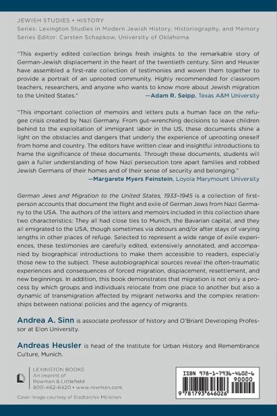German Jews and Migration to the United States, 1933-1945 is a collection of first-person accounts, many previously unpublished, that document the flight and exile of German Jews from Nazi Germany to the USA,. The authors of the letters and memoirs included in this collection share two important characteristics: They all had close ties to Munich, the Bavarian capital, and they all emigrated to the USA, though sometimes via detours and/or after stays of varying lengths in other places of refuge. Selected to represent a wide range of exile experiences, these testimonies are carefully edited, extensively annotated, and accompanied by biographical introductions to make them accessible to readers, especially those who are new to the subject. These autobiographical sources reveal the often-traumatic experiences and consequences of forced migration, displacement, resettlement, and new beginnings. In addition, this book demonstrates that migration is not only a process by which groups and individuals relocate from one place to another but also a dynamic of transmigration affected by migrant networks and the complex relationships between national policies and the agency of migrants.