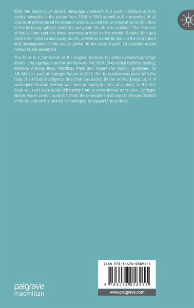 With the research of German-language children's and youth literature and its media associations in the period from 1900 to 1945 as well as the recording of all data in an online portal for research and visual analysis, an innovative contribution to the historiography of children's and youth literature is available. The introduction provides information on the criteria for inclusion, central sources, theoretical frameworks, and the spectrum of the media associations investigated. Part I assembles three overview articles on the media of radio, film and theater for children and young people as well as a contribution on the conception and development of the online portal. In the second part, 18 selected media alliances are presented, sorted into the categories pioneers conquer the new media - stage children migrate to radio and/or film - fairy tales in film and radio - classics in all media - school stories in the theater, book and on the screen - crime and scandal on the screen - political conquers book and film.