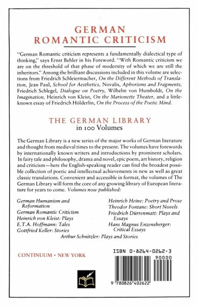 Includes: Schleiermacher's "On the Different Methods of Translation;" Jean Paul's "School for Aesthetics;" Novalis's "Aphorisms and Fragments;" Schlegel's "Dialogue on Poetry and Lectures on Dramatic Art and Literature;" Holderlin's "On the Process of the Poetic Mind;" von Kleist's "On the Marionette Theater;" Muller's "Twelve Lectures on Rhetoric;" von Humboldt's "On the Imagination;" Gorres's "The German Chapbooks;" and Grimm's "On The Origin of Language.">