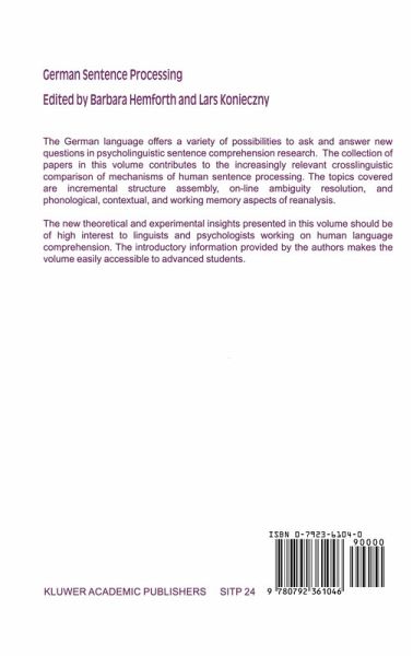 The present volume contributes to the growing body of work on sentence pro cessing. The goal of work in this area is to construct a theory of human sen tence processing in general, i.e., given a grammar of some particular language and a general characterization of the human sentence processing mechanisms, the particular processing system for that language should follows automati cally. At least that's the goal. What is needed in order to pursue this goal is systematic in-depth analysis of the sentence routines of individual languages. With respect to German, that is precisely what the present volume delivers. In sharp contrast to a decade ago, the study of German sentence process ing is flourishing today. Four lively and active centers have emerged. The University of Freiburg is one prominent center, represented in the present vol ume by the editors Barbara Hemforth and Lars Konieczny (who was at Freiburg for many years) as well as by Christoph Scheepers (who is now in Glasgow) and Christoph Holscher. The University of Potsdam has recently begun an interdisciplinary collaboration on sentence processing involving Matthias Schlesewsky, Gisbert Fanselow, Reinhold Kliegl and Josef Krems. The University of Jena has several investigators trained in linguistics and interested in language processing. That group is represented here by Markus Bader and also includes his colleagues Michael Meng and Josef Bayer.