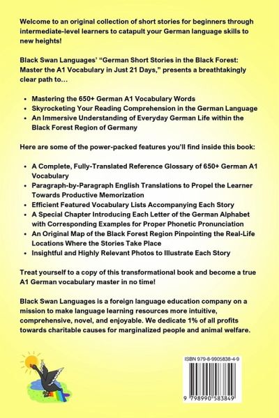 **This Book Is the Updated 2nd Edition!!** Have you ever wished that you could improve your German vocabulary through a highly productive system that also makes you feel like you're on a vacation? Well... now, you can! Readers will be thrilled to achieve the following key results through this book alone: ¿ Systematically master the 650+ A1 level German vocabulary in as little as 21 days or under a self-paced schedule ¿ Comfortably read sixteen bilingual short stories written specifically for beginners up through those with some prior German study but are not yet conversationally fluent ¿ Effortlessly acquire a better understanding of the nuances of everyday life in the Black Forest region of Germany ¿ Confidently pronounce most, if not all, of the German words in the stories after reviewing the special chapter focusing on pronunciation with lots of clear examples And, there's still more. For a richer and more guided experience, this book also features: ¿ An introductory chapter on how to best utilize this book ¿ A short, fun primer chapter on the Black Forest region of Germany ¿ A hand-drawn, original map pinpointing the locations where the stories take place ¿ Sixteen highly relevant photos to provide mental imagery for each of the stories In short, if you'd like to make the most of your time while feeling uplifted as you easily absorb the A1 level German vocabulary, then you'll absolutely love "German Short Stories in the Black Forest." So... fasten your seatbelts, prepare to skyrocket your German vocabulary to the next level, and grab your copy today!