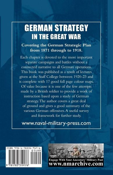 Covering the German Strategic Plan from 1871 through to 1918. Each chapter is devoted to the more important separate campaigns and battles without a connected narrative to all German operations. This book was published as a result of lectures given at the Staff College between 1920-23 and is complete with 17 good full page colour maps. Of value because it is one of the few attempts made by a British soldier to provide a work of instruction based upon a study of German strategy. The author covers a great deal of ground and gives a good summary of the various German offensives. A useful survey and framework for further study.…mehr