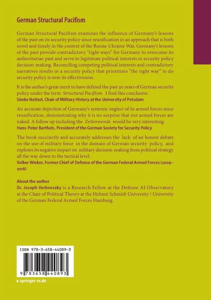 German Structural Pacifism examines the influence of Germany's lessons of the past on its security policy since reunification in an approach that is both novel and timely in the context of the Russia-Ukraine War. Germany's lessons of the past provide contradictory "right ways" for Germany to overcome its authoritarian past and serve to legitimate political interests in security policy decision-making. Reconciling competing political interests and contradictory narratives results in a security policy that prioritizes "the right way" to do security policy is over its effectiveness.