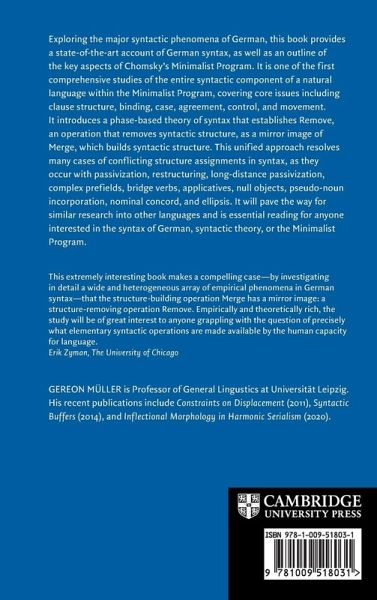 Exploring the major syntactic phenomena of German, this book provides a state-of-the-art account of German syntax, as well as an outline of the key aspects of Chomsky's Minimalist Program. It is one of the first comprehensive studies of the entire syntactic component of a natural language within the Minimalist Program, covering core issues including clause structure, binding, case, agreement, control, and movement. It introduces a phase-based theory of syntax that establishes Remove, an operation that removes syntactic structure, as a mirror image of Merge, which builds syntactic structure. This unified approach resolves many cases of conflicting structure assignments in syntax, as they occur with passivization, restructuring, long-distance passivization, complex prefields, bridge verbs, applicatives, null objects, pseudo-noun incorporation, nominal concord, and ellipsis. It will pave the way for similar research into other languages and is essential reading for anyone interested in the syntax of German, syntactic theory, or the Minimalist Program.