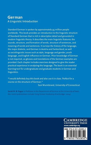 Standard German is spoken by approximately 95 million people worldwide. This book provides an introduction to the linguistic structure of standard German that is rich in descriptive detail and grounded in modern linguistic theory. It describes the main linguistic features: the sounds, structure and formation of words, structure of sentences, and meaning of words and sentences. It surveys the history of the language, the major dialects, German in Austria and Switzerland, as well as sociolinguistic issues such as style, language and gender, youth language, and English influence on German. Prior knowledge of German is not required, as glosses and translations of the German examples are provided. Each chapter includes exercises designed to give the reader practical experience in analyzing the language. It is an essential learning tool for undergraduate and graduate students in German and linguistics.