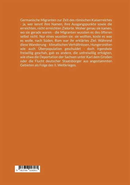 Germanische Migranten zur Zeit des römischen Kaiserreiches - ja, wer kennt ihre Namen, ihre Ausgangspunkte sowie die erreichten, nicht erreichten Zielorte. Woher genau sie kamen, wo sie gerade waren - die Migranten wussten es des öfteren selbst nicht. Nur eines wussten sie, sie wollten, koste es was es wolle, nach Süden, Rom war ihr erklärtes Ziel. Während diese Wanderung - klimatischen Verhältnissen, Hungersnöten wie auch Überpopulation geschuldet - doch irgendwie freiwillig geschah, gab es andere, die unfreiwillig erfolgten, wie etwa die Deportation der Sachsen unter Karl dem Großen oder die Flucht deutscher Staatsbürger aus angestammten Gebieten als Folge des II. Weltkrieges.