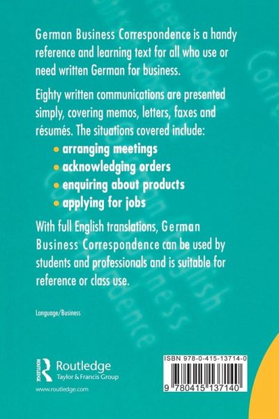 German/English Business Correspondence is a handy reference and learning text for all who use written German. 80 written communications are simply presented covering memos, letters, faxes and resumes. The situations covered include: * arranging meetings * acknowledging orders * enquiring about products * applying for jobs With full English translations, this text is suitable for both students and professionals and can be used for either reference or class use.