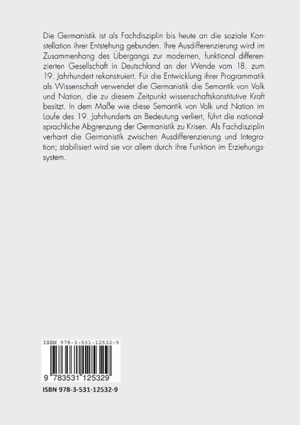 Die Germanistik ist als Fachdisziplin bis heute an die soziale Konstellation ihrer Entstehung gebunden. Ihre Ausdifferenzierung wird im Zusammenhang des Übergangs zur modernen, funktional differenzierten Gesellschaft in Deutschland an der Wende vom 18. zum 19. Jahrhundert rekonstruiert. Für die Entwicklung ihrer Programmatik als Wissenschaft verwendet die Germanistik die Semantik von Volk und Nation, die zu diesem Zeitpunkt wissenschaftskonstitutive Kraft besitzt. In dem Maße wie diese Semantik von Volk und Nation im Laufe des 19. Jahrhunderts an Bedeutung verliert, führt die nationalsprachliche Abgrenzung der Germanistik zu Krisen. Als Fachdisziplin verharrt die Germanistik zwischen Ausdifferenzierung und Integration, stabilisiert wird sie vor allem durch ihre Funktion im Erziehungssystem.