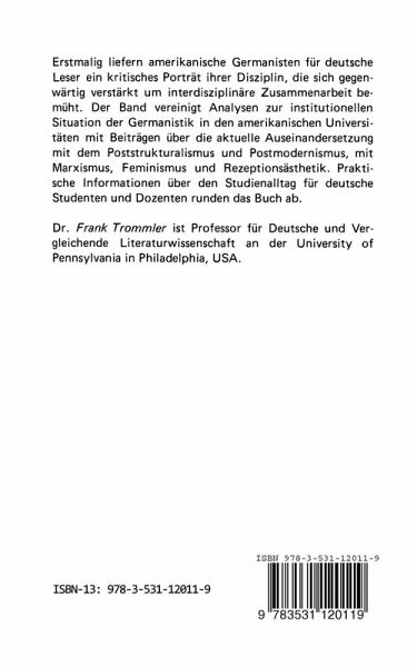 Frank Trommler Was eine Kultur als selbstverstlindlich voraussetzt, muB in einer anderen erst definiert und bewiesen werden. Germanistik in den USA ist nicht dasselbe Fach wie in Deutschland, auch wenn viele Inhalte gleich lauten. Dieser Band versucht, mit einer aktuellen Bestandsaufnahme zugleich etwas von den andersgearteten Tradi tionen und Bedingungen der Disziplin in den Vereinigten Staaten erkennbar zu machen. Er ist in dieser Form ohne Vorliiufer und versteht sich als eine Darstellung fiir deutsche Leser, deren Inter esse am Gegenstand nicht vorausgesetzt werden kann und durch eine langatmige historische Untersuchung kaum gefOrdert wiirde. In der Kiirze soil sich in diesem FaIle nicht nur Wiirze, sondern auch Zweckdienlichkeit kundtun. DaB Geisteswissenschaftler von sich selbst reden, auch wenn sie nicht von sich reden, ist bestens bekannt; reden sie dann auch noch von ihrer Disziplin, ist die Idio synkrasie voIlkommen. Obwohl man letzteres neuerdings ohne viel ZOgern zur Gegenstandsbestimmung wissenschaftlichen Ar beitens hinzurechnet, ist es hier auf ein MindestmaB beschrankt worden, auf die Gefahr hin, daB wichtige Aspekte des germanisti schen AIltags in Amerika unter den Tisch fallen. Besser der Vor wurf, es Mtte mehr sein kOnnen, als der, es Mtte weniger idiosyn kratisch sein sollen.