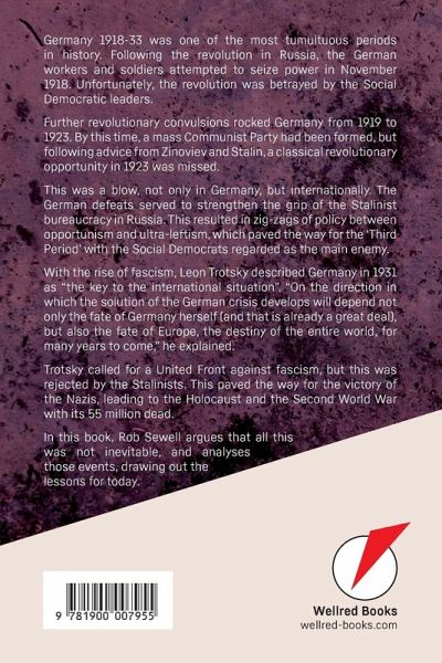 Germany 1918-33 was one of the most tumultuous periods in history. Following the revolution in Russia, the German workers and soldiers attempted to seize power in November 1918. Unfortunately, the revolution was betrayed by the Social Democratic leaders. Further revolutionary convulsions rocked Germany from 1919 to 1923. By this time, a mass Communist Party had been formed, but following advice from Zinoviev and Stalin, a classical revolutionary opportunity in 1923 was missed. This was a blow, not only in Germany, but internationally. The German defeats served to strengthen the grip of the Stalinist bureaucracy in Russia. This resulted in zig-zags of policy between opportunism and ultra-leftism, which paved the way for the ‘Third Period’ with the Social Democrats regarded as the main enemy. With the rise of fascism, Leon Trotsky described Germany in 1931 as "the key to the international situation". "On the direction in which the solution of the German crisis develops will depend not only the fate of Germany herself (and that is already a great deal), but also the fate of Europe, the destiny of the entire world, for many years to come," he explained. Trotsky called for a United Front against fascism, but this was rejected by the Stalinists. This paved the way for the victory of the Nazis, leading to the Holocaust and the Second World War with its 55 million dead. In this book, Rob Sewell argues that all this was not inevitable, and analyses those events, drawing out the lessons for today.