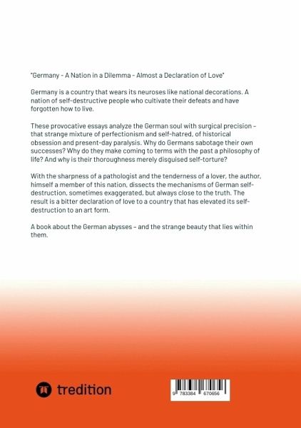 Germany - A Nation in a Dilemma - Almost a Declaration of LoveGermans seem to love their defeats like other nations love their victories. Why? This nation, which licks its history like a wound and takes pleasure in doing so, is the subject of a book that dissects the dilemma of an entire culture: "Germany - A Nation in a Dilemma - Almost a Declaration of Love."Germany - a country that has turned failure into an art form. The author of this provocative work, Hermann Selchow, dissects the German soul with the precision of a pathologist and the tenderness of a lover. The result: a literary X-ray of a nation, sometimes exaggerated, but always close to the truth.The famous German thoroughness reveals itself as systematic self-dismantling, the drive for perfection as paralysis through analysis. Coming to terms with the past becomes a denial of the present. A people that wears its neuroses like medals and forgets how to live.But this book is no cheap voyeurism of German defects. It is adiagnosis with heart, a criticism without contempt. The author, himself a member of this people, not only exposes the mechanisms of German self-sabotage but also demonstrates its productive power. For those who destroy themselves so virtuosically also master the art of renewal.German readers will feel caught out - and perhaps for the first time, be able to smile at their own abysses. Foreigners will gain insight into the psychic landscape of a people who guard their traumas like relics. Sociologists and psychologists may find material for years of analysis.The book is written in the style of a loving postmortem: perceptive without coldness, ironic without cynicism. A rare balance between science and humanity.The question for the future remains: Can the Germans overcome their self-destruction? Or is it perhaps their most precious asset? The author offers no easy answers, but the right questions."Germany - A Nation in a Dilemma" is therapy as literature, social criticism as an act of love. A book for all who want to understand Germany - and for Germans who finally want to tolerate themselves.