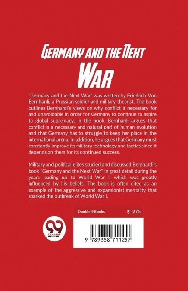 "Germany and the Next War" was written by Friedrich Von Bernhardi, a Prussian soldier and military theorist. The book outlines Bernhardi's views on why conflict is necessary for and unavoidable in order for Germany to continue to aspire to global supremacy. In the book, Bernhardi argues that conflict is a necessary and natural part of human evolution and that Germany has to struggle to keep her place in the international arena. In addition, he argues that Germany must constantly improve its military technology and tactics since it depends on them for its continued success. Military and political elites studied and discussed Bernhardi's book "Germany and the Next War" in great detail during the years leading up to World War I, which was greatly influenced by his beliefs. The book is often cited as an example of the aggressive and expansionist mentality that sparked the outbreak of World War I.