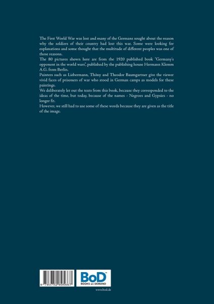 The First World War was lost and many of the Germans sought about the reason why the soldiers of their country had lost this war. Some were looking for explanations and some thought that the multitude of different peoples was one of those reasons.The 80 pictures shown here are from the 1920 published book "Germany's opponent in the world wars", published by the publishing house Hermann Klemm A.G. from Berlin.Painters such as Liebermann, Thöny and Theodor Baumgartner give the viewer vivid faces of prisoners of war who stood in German camps as models for these paintings.We deliberately let out the texts from this book, because they corresponded to the ideas of the time, but today, because of the names - Negroes and Gypsies - no longer fit.However, we still had to use some of these words because they are given as the title of the image.